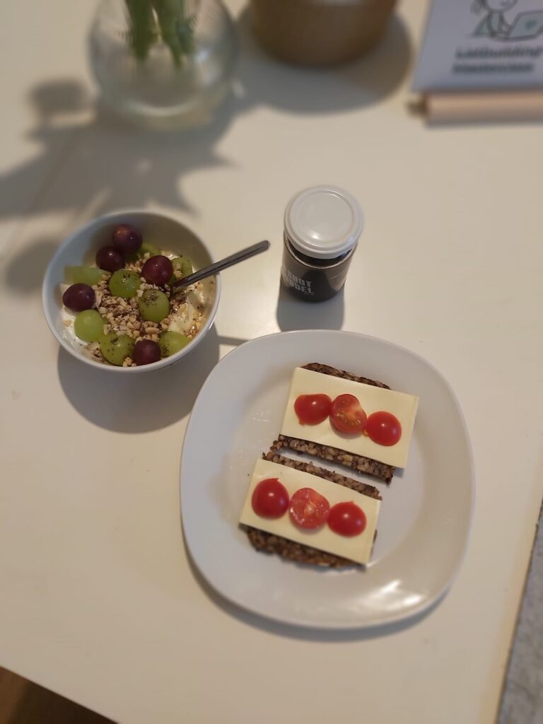 Und dann einen Kaffee mit Mandelmilch und ein kleines Frühstück, bevor es an den Schreibtisch geht.