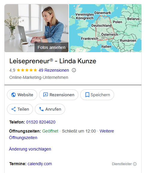 Mit ihrem Business Leisepreneur® unterstützt sie solo-selbstständige Frauen dabei, auch ohne Social Media sichtbar und erfolgreich zu sein.